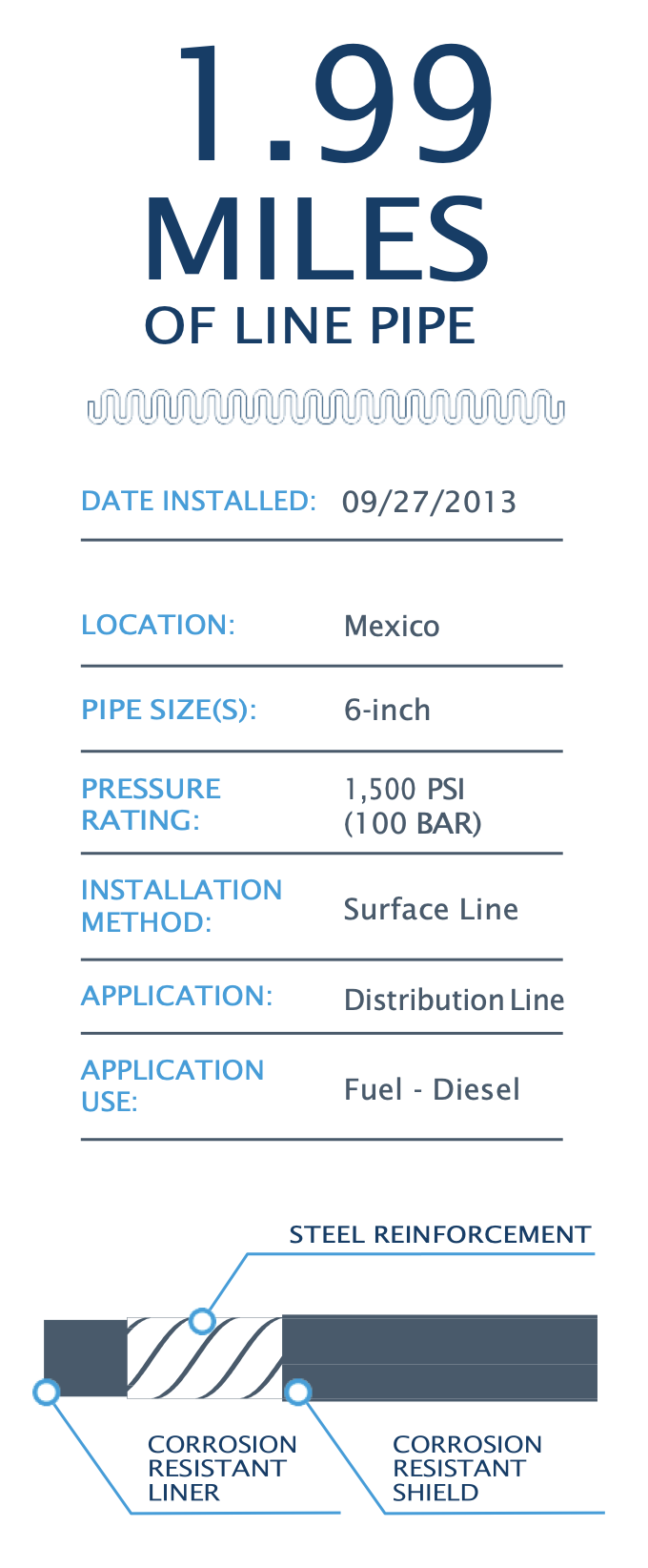 The company has been extremely pleased with the reliability and performance of FlexSteel’s pipelines. After commissioning the four bypass lines, the company’s engineers noted that there was no vibration, movement, or pressure drop, despite the high rates at which the lines were delivering crude oil and gasoline. It is estimated that FlexSteel saved the company approximately USD 50 million by rapidly restoring the pipelines to service, which eliminated the need to use trucks to deliver crude oil and gasoline to Mexico City. Because of this project, the company plans to use FlexSteel 2-inch line pipe for a future 8-inch pipe-in-pipe rehabilitation project.